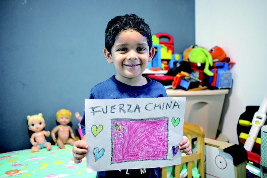 2月10日,在巴拿马首都巴拿马城,男孩马特奥·巴伦苏埃拉作画表达对中国的支持。画中写着:加油中国!
