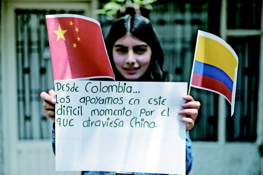 2月7日,在哥伦比亚首都波哥大,女孩安娜·索菲娅为抗击新冠肺炎疫情的中国加油。她写道:“在中国面临的这个艰难时刻,我们在哥伦比亚送上祝福和支持。”