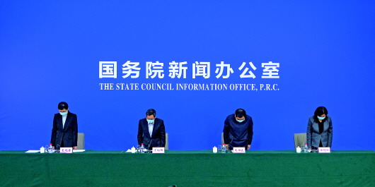 2月20日,国务院新闻办公室在湖北武汉举行新闻发布会,请中央指导组成员、国务院副秘书长丁向阳,中央指导组成员、发展改革委副主任连维良,中央指导组成员、卫生健康委党组成员、中医药局党组书记、副局长余艳红介绍中央赴湖北指导组组织开展疫情防控工作情况,并答记者问。发布会上,中央指导组对一直奉献在一线的同志们致以崇高敬意,对英勇牺牲的医务人员和不幸去世的患者表示深切哀悼,并在现场举行了默哀仪式。 新华社记者肖艺九摄
