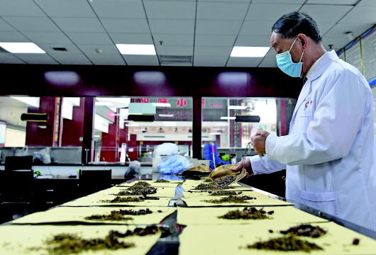 唐祖宣在邓州市中医院药房内调剂中药材(2月9日摄)。新华社发(郝源摄) |