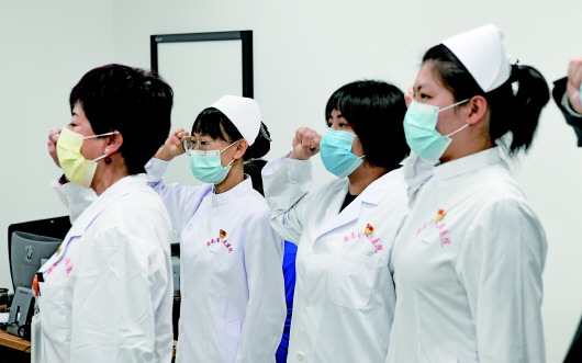 ▲2月20日,海南省人民医院心血管内科护士张曦(左二)、检验科医生何佩芳(右二)、神经外科ICU护士黄显雅(右)在领誓人带领下庄严宣誓。当日,海南省人民医院举行一场特殊的入党仪式,3名医护人员在领誓人的带领下,面向党旗,高举右手,握紧拳头,庄严宣誓;5名医护人员在海口医学隔离观察点同步通过视频连线的方式庄严宣誓。据了解,经海南省人民医院党委研究决定,批准第一批进入一线隔离病房,表现优秀的8名青年医护人员“火线入党”,成为中国共产党预备党员。 新华社记者杨冠宇摄