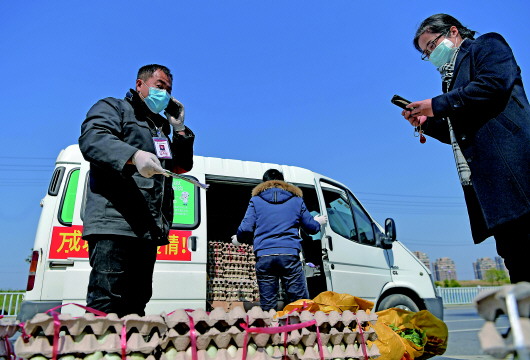 2月20日,在南昌市红谷滩新区,应文伟(左)在给顾客送鸭蛋和蔬菜。应文伟是江西省南昌市南昌县南新乡九联村的驻村第一书记。新冠肺炎疫情发生后,村里大量鸭蛋和蔬菜卖不出去。为了帮助村民解决燃眉之急,应文伟通过朋友圈等方式发布信息,帮助村民出售村里的鸭蛋和蔬菜,并提供送货上门服务。经过一段时间的努力,村里的鸭蛋和蔬菜销售越来越好。应文伟说,每天出来送货,回去还要忙村里的工作,虽然累一点,但是能帮村民们解决问题,他们高兴自己也开心。 新华社记者彭昭之摄