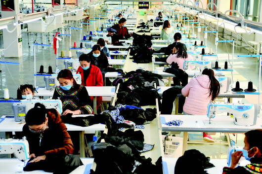 ▲贵州省册亨县云娇布依特色染织刺绣公司工人在制作服装(2月19日摄)。新华社记者杨文斌摄