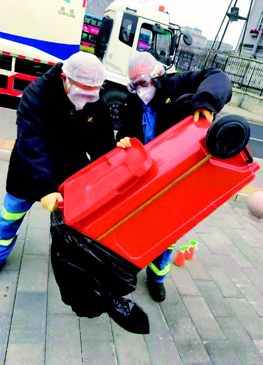 ▲1月28日,在珠市口附近,西环二队废弃口罩清运突击队的队员们正在清理专门收纳废弃口罩的垃圾箱。为了防止二次污染,他们想尽办法不让口罩落地。