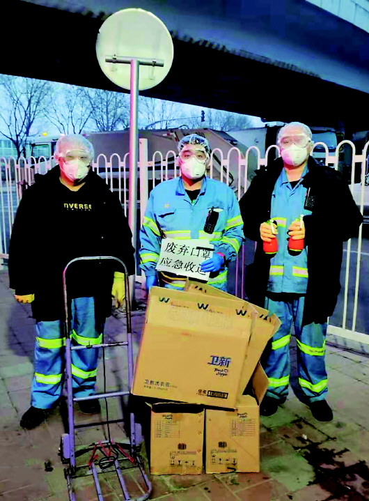 ▲北京市西城区环卫二队运输班在1月25日紧急成立废弃口罩清运突击队。这是突击队第一梯队队员,从左到右分别为:刘震、刘磊和李曌苏。本报记者尹平平摄