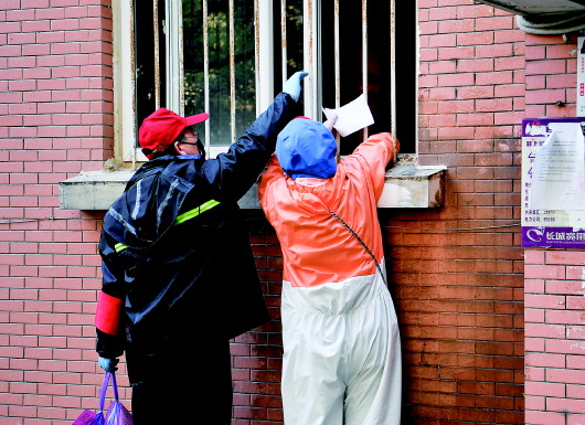 武汉市武昌区华锦社区的志愿者从窗口为一名行动不便的老人递爱心菜。