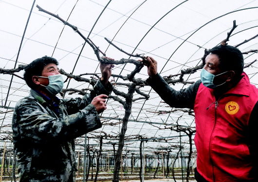 2月26日,东洲街道的农技人员(右)在天府葡萄专业合作社的葡萄大棚内给种植户进行技术指导。近期,浙江省杭州市富阳区东洲街道成立由农业部门的党员志愿者组成的“春耕工作临时党支部”,党员志愿者积极送农资、送农技、送服务给种养殖户们。