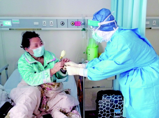 近日武汉气温逐步升高,室外的花也开了,在武汉协和医院西院区病区支援的北京市属医院医疗队队员、北京中医医院主管护师蔡卫敏上班前会在驻地采一些小花,消毒后送到病患手里,让她们感受大自然和春天,树立信心战胜病魔。新华社发