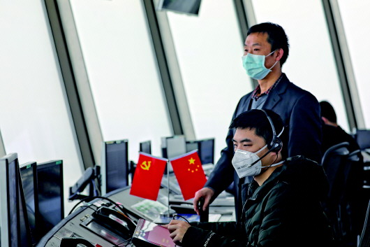 2月13日,武汉天河机场塔台管制员在工作。 新华社发(邵子扬摄)