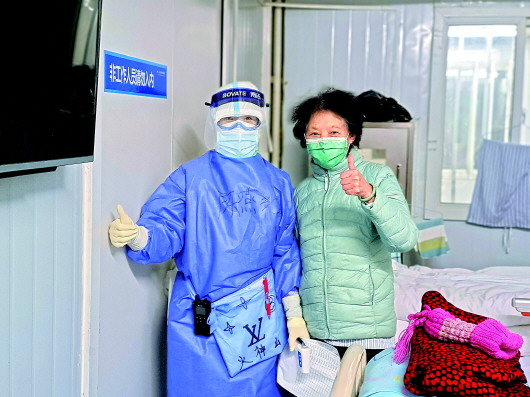 3月2日,护士陈燕红(左)为患者加油。新华社发(钟玲摄) |