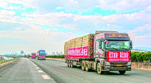 ▲云南保山支援武汉爱心物资运输车队从保山出发(2月14日摄)。