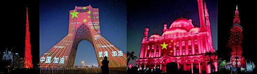 ▲这张拼版照片显示的是(从左至右)阿联酋迪拜哈利法塔、伊朗德黑兰自由塔、埃及开罗萨拉丁城堡和日本东京塔纷纷点亮“中国红”。