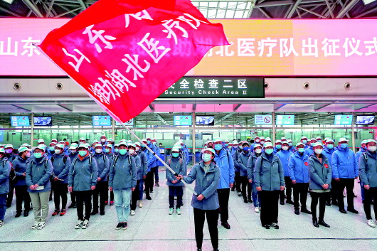 2月15日,山东省支援湖北医疗队从济南遥墙国际机场集合出发,前往湖北黄冈支援疫情防控和救治工作。