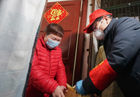 3月2日,武汉市江岸区球新社区志愿者(右)为社区里的低保户送货上门。3月2日,湖北省武汉市江岸区四千多户低保户收到了爱心物品,包括一刀肉(5斤)、一箱奶(24盒)、一桶油(5升)、一袋米(20斤)、一箱蛋(30枚)。这些物资是由爱心企业捐赠资金,由中百仓储超市有限公司负责组织货源,并配送至全区各街道,再由社区工作人员和志愿者接力,送到150个社区里的每户低保户家中。新华社记者程敏摄