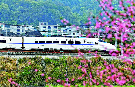 初春时节,贵州黔东南苗族侗族自治州的油菜花、桃花陆续绽放,动车组列车穿行其间,美不胜收(3月4日摄)。 新华社记者杨文斌摄