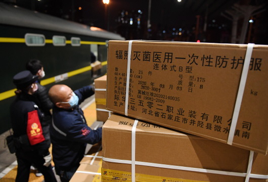 ▲3月4日,在北京西站,工作人员在装运防护服。当日,800箱共计20000件防护服从北京西站搭乘Z285次列车运往武汉支援抗疫。 新华社记者张晨霖摄