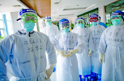 2月22日,来自江苏医疗队的90后队员葛愿(左三)等在武汉市第一医院为武汉祝福加油。新华社记者肖艺九摄 |