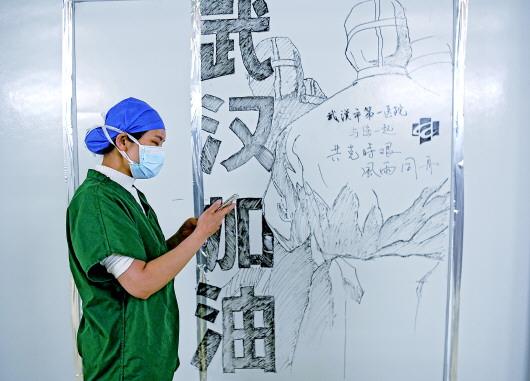 雷神山医院走道间的墙,逐渐成为医护人员和工作人员表达内心感受的窗口,他们在此画画、写字……