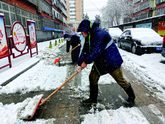 ▲2月14日,郭光彬(前)在平谷区金谷园2号楼前扫雪铲冰。 (张亚军摄) |