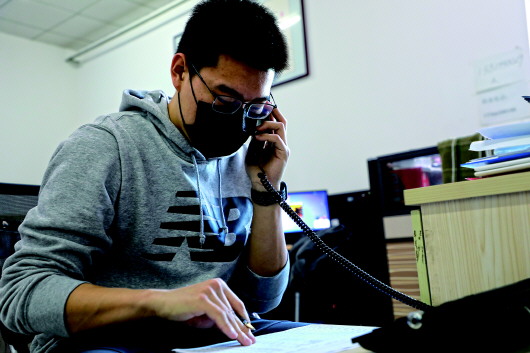 ▲2月22日,党民月在社区居委会通过电话联系居家观察的居民。(李顺摄) |