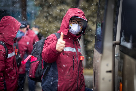 广东医疗队员从荆州驻地酒店登车前往指定医院(2月15日摄)。 新华社发 |