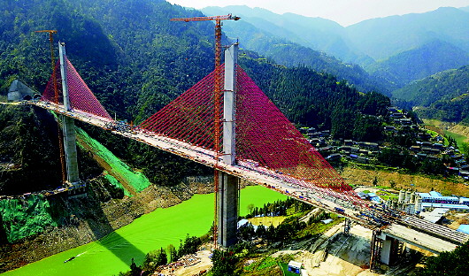 近日,贵州剑河至榕江高速公路控制性工程——清水江特大桥有序复工(3月8日摄)。 新华社记者杨文斌摄