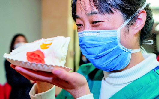 ▲3月8日,在武汉市蔡甸区明德酒店,武汉开发区(汉南区)援汉医疗队接待协调组驻明德酒店服务专班为在该酒店驻扎的北京市属医院医疗队的医护人员举行庆祝“三八”妇女节活动暨三月集体生日会。图为一名北京市属医院医疗队队员准备享用蛋糕。新华社记者才扬摄