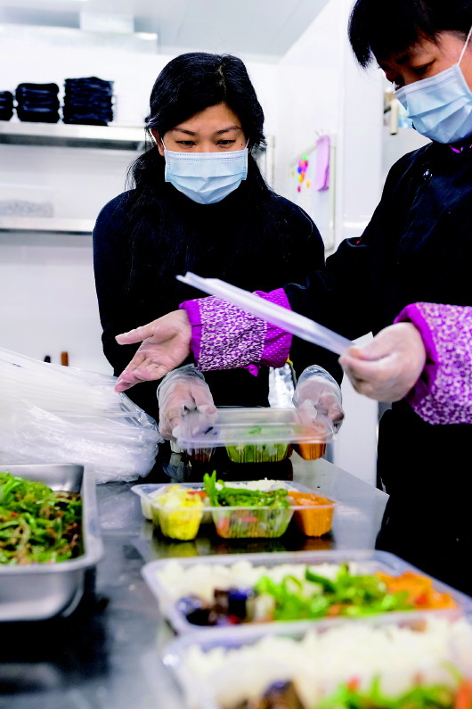3月7日,肖晶(左)与舅妈一起分装盒饭。 |