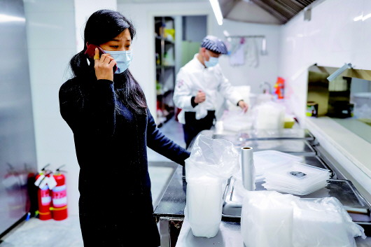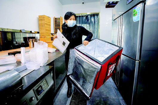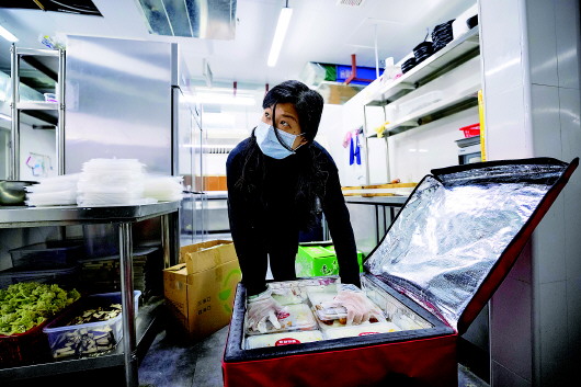 3月7日,肖晶将分装好的盒饭装入消过毒的送餐保温箱。 |