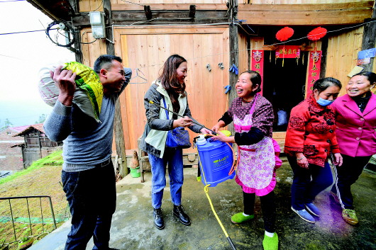 3月7日,在锦屏县河口乡加池村,锦屏县融媒体中心帮扶干部杨晓琴(左二)和队友给群众送农用物资。2019年7月,贵州省黔东南苗族侗族自治州锦屏县融媒体中心与河口乡加池村结成了帮扶对子。加池村距离县城50多公里,是锦屏县的深度贫困村之一。杨晓琴作为锦屏县融媒体中心的负责人,她吃住在村里,与驻村队员一起谋划脱贫之策。杨晓琴通过多方联系筹集资金,用于整治和美化村庄人居环境,同时带动农户发展魔芋产业600余亩。 新华社记者杨楹摄