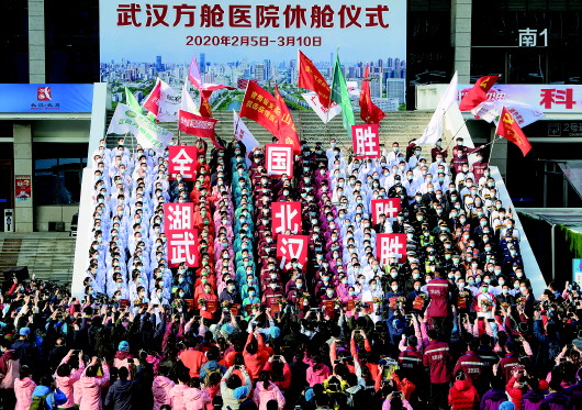 ▲3月10日,医护人员在武昌方舱医院前庆祝。当日,武汉所有方舱医院全部休舱。 新华社记者肖艺九摄