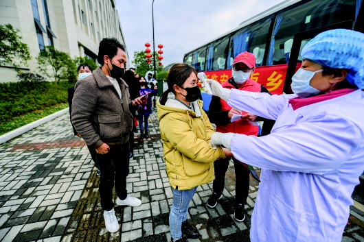 三月一日,浙江省杭州市临安区高虹镇的医护人员和党员志愿者在暖心驿站外迎接刚刚乘包车抵达的外来务工人员,同时测量体温,检查健康码并登记。高虹镇专门设立了“新高虹人暖心驿站”,作为返工或新来外来务工人员抵达临安后的下车休息处。同时由高虹镇党建办组织的党员志愿者和医护人员在此开展服务,包括测量体温、送口罩、普及防疫知识、联系租住地及发布招工和租房信息,助力企业复工复产。新华社记者徐昱摄