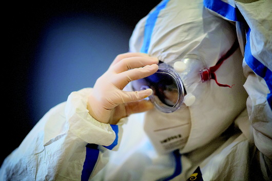 ▲海军军医大学医疗队员在穿戴防护服(1月27日摄)。 新华社记者肖艺九摄 |