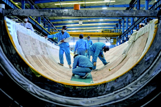 在时代新材蒙西分公司的厂区门口,经过测温、身份登记和车辆消毒后,记者进入生产车间内,在70多米长的生产模具上,工人们正在加紧制作风电叶片。“2月中旬公司复工复产,刚开始生产线上的返岗员工只有50多名,上岗率不到1/10。”该公司运营副总经理王树慧说,随着陆续解除隔离,目前员工已全部返岗,实现满负荷生产,风电叶片产能达到100只/月。
