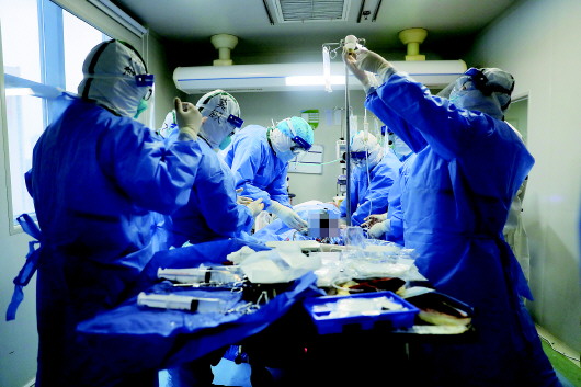 ▲3月21日,在武汉市肺科医院,医生在进行手术。当日,在武汉市肺科医院,来自北京、江苏、浙江、安徽、湖北、内蒙古的医生联手抢救一名已经休克的七旬男性危重新冠肺炎患者。不同学科的医生们轮流上阵,经过3个多小时的共同努力,成功完成手术。 新华社发(柯皓摄)