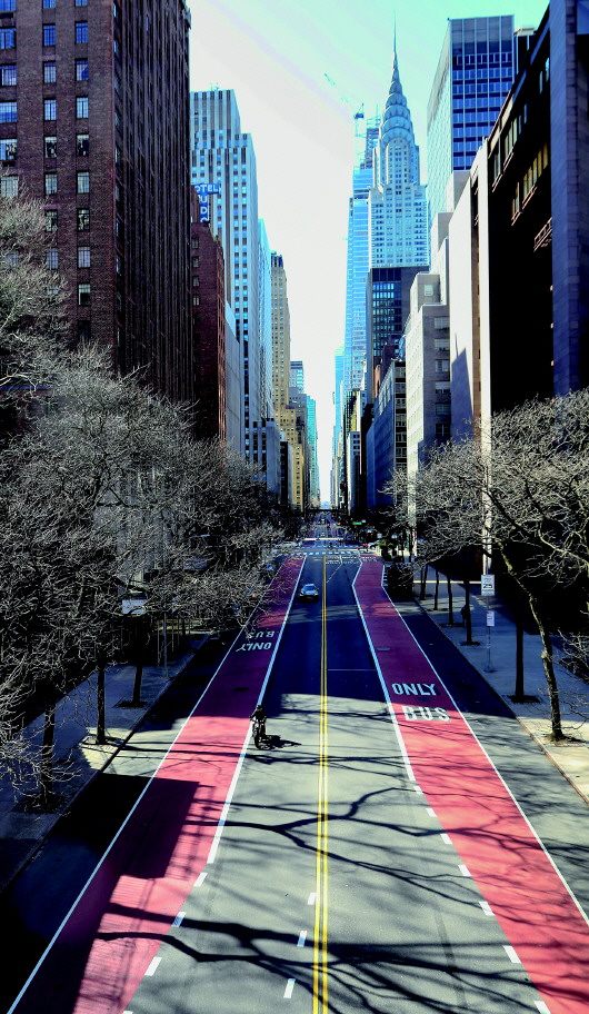 3月21日,在美国纽约,以往繁忙的街道上车辆寥寥。