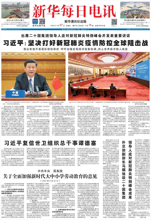 | ( 2020-03-27 ) 稿件来源:新华每日电讯 要 闻 |