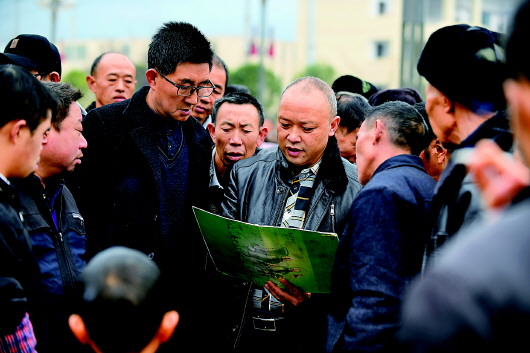 吴太玺(中)在贵州正安县瑞濠街道移民安置点与搬迁户一起讨论文艺演出进搬迁小区的快板词(2019年12月25日摄)。新华社记者杨文斌摄 |
