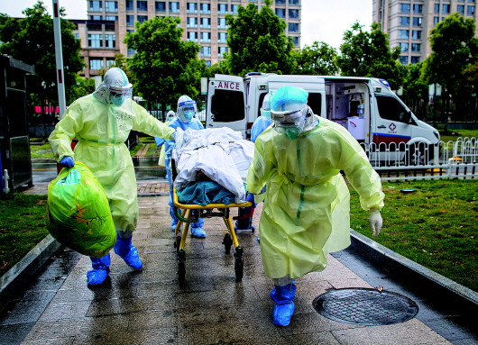 ▲3月29日,医务人员将新冠肺炎患者转运至华中科技大学同济医院中法新城院区。