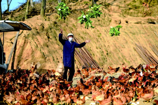 养殖户杨棚图在农场里喂鸡。抗击疫情的同时,浙江省诸暨市针对农产品销售难问题开展服务,杨棚图农场里因疫情影响积压的五千多只鸡、十万多个鸡蛋,全都卖了出去。