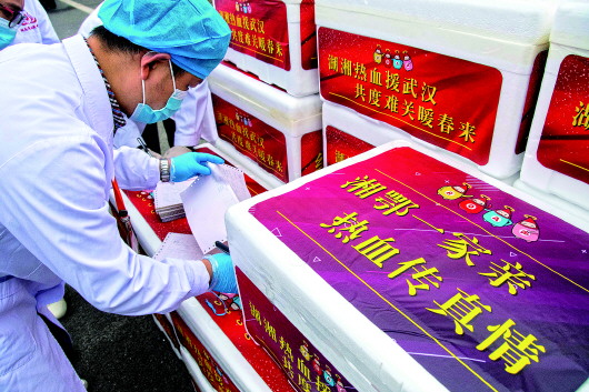 当日,爱心血液从湖南省血液中心出发,被运送至湘鄂交界处的湖南岳阳荣家湾收费站出口,与武汉血液中心完成交接。据了解,新冠肺炎疫情发生以来,湖南省支援湖北省临床用血29批次。新华社发(陈思汗摄)