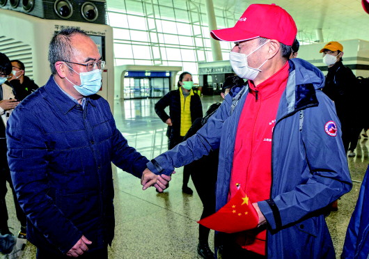 ◥3月31日,武汉市金银潭医院院长张定宇(前左)在天河机场送别上海医疗队。