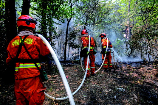 4月1日,四川省森林消防总队队员用水扑灭余火和烟点。