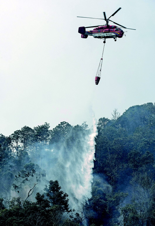 4月1日,一架卡-32大型直升机在西昌森林火灾现场扑火。