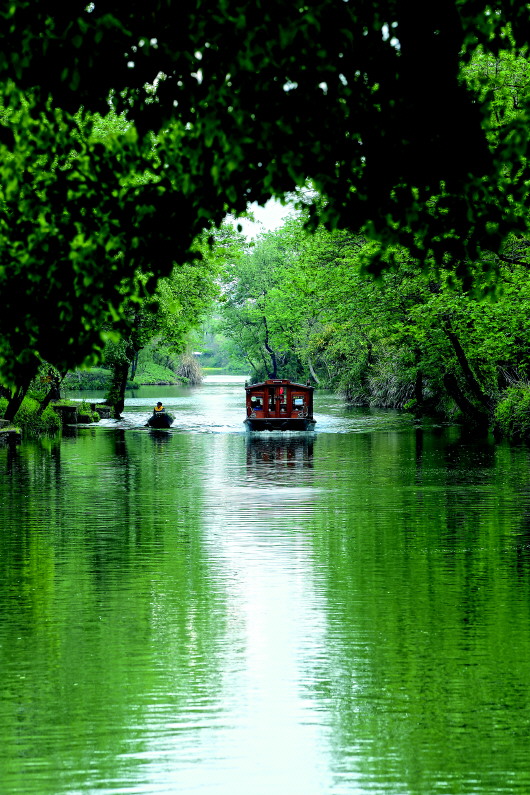 4月1日,船只行驶在西溪湿地的水道上。新华社记者翁忻旸摄
