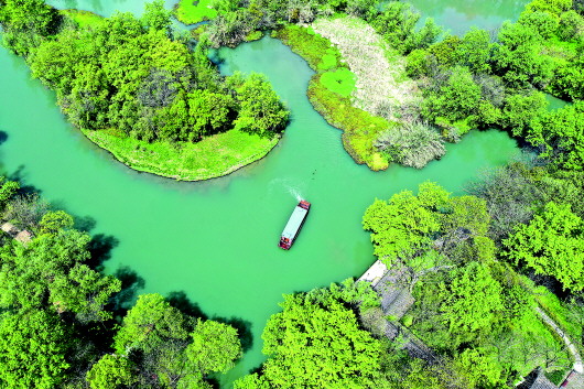 4月1日,船只在西溪湿地水道上行驶(无人机照片)。新华社记者翁忻旸摄 |