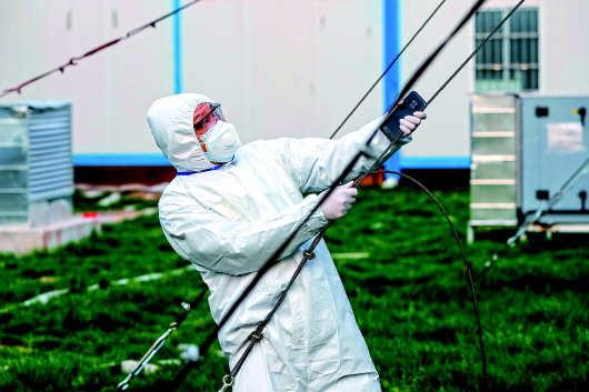 3月31日,中建三局项目经理尹典在武汉火神山医院检查连接重症病房的排风管的稳固性。新华社记者沈伯韩摄