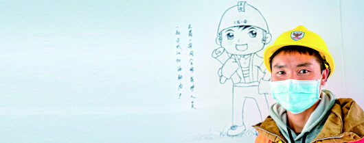 3月29日,在武汉雷神山医院,中建三局员工和他画的漫画合影。新华社记者才扬摄