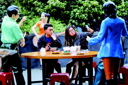 ▲4月5日,人们在武汉市吉庆街的“大排档”雕塑旁吃热干面。