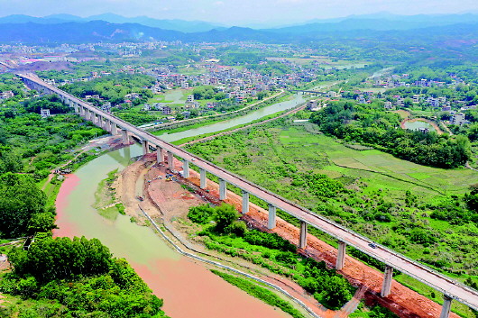 4月7日拍摄的赣深铁路五标段柏埔河特大桥。当日,江西赣州至深圳高速铁路五标段开始无砟轨道混凝土浇筑施工。新华社记者刘大伟摄